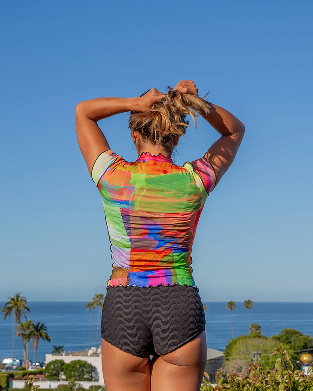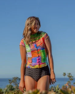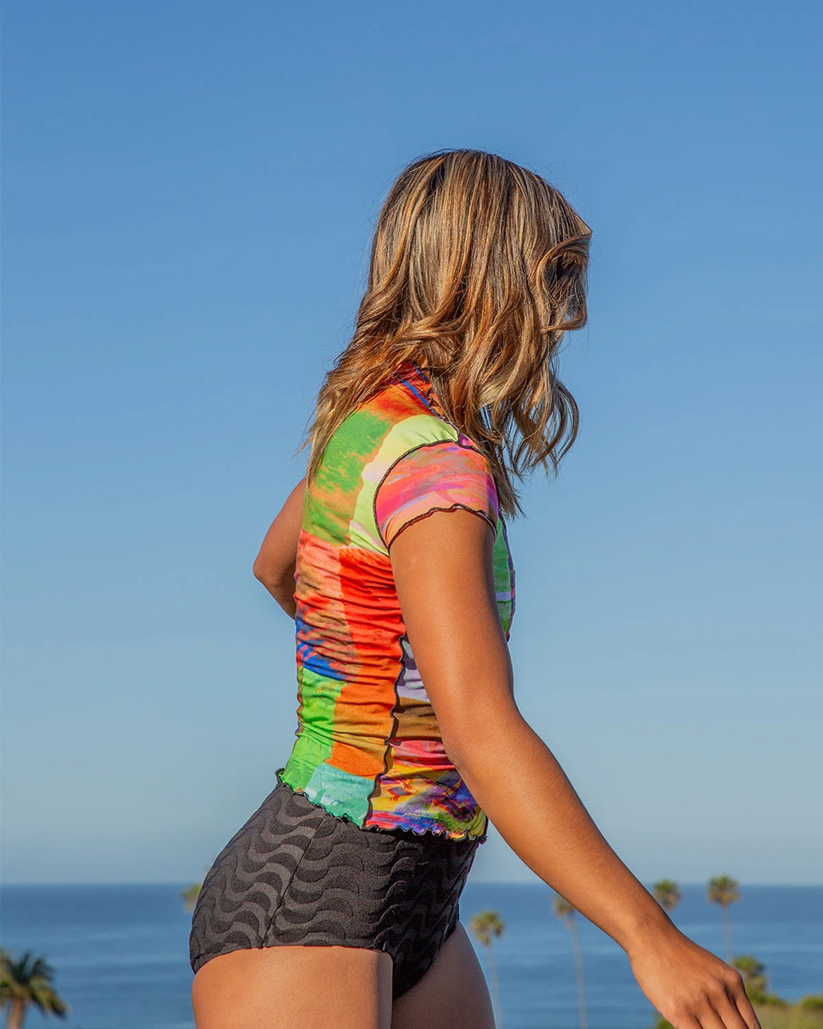Sweeter than a post-surf sunset, the Leo top features a feminine lettuce hem and cute capped sleeves. Constructed from recycled texture fabric, Leo is the perfect in-between length: longer than our cropped rashguards, but shorter than the Doheny.