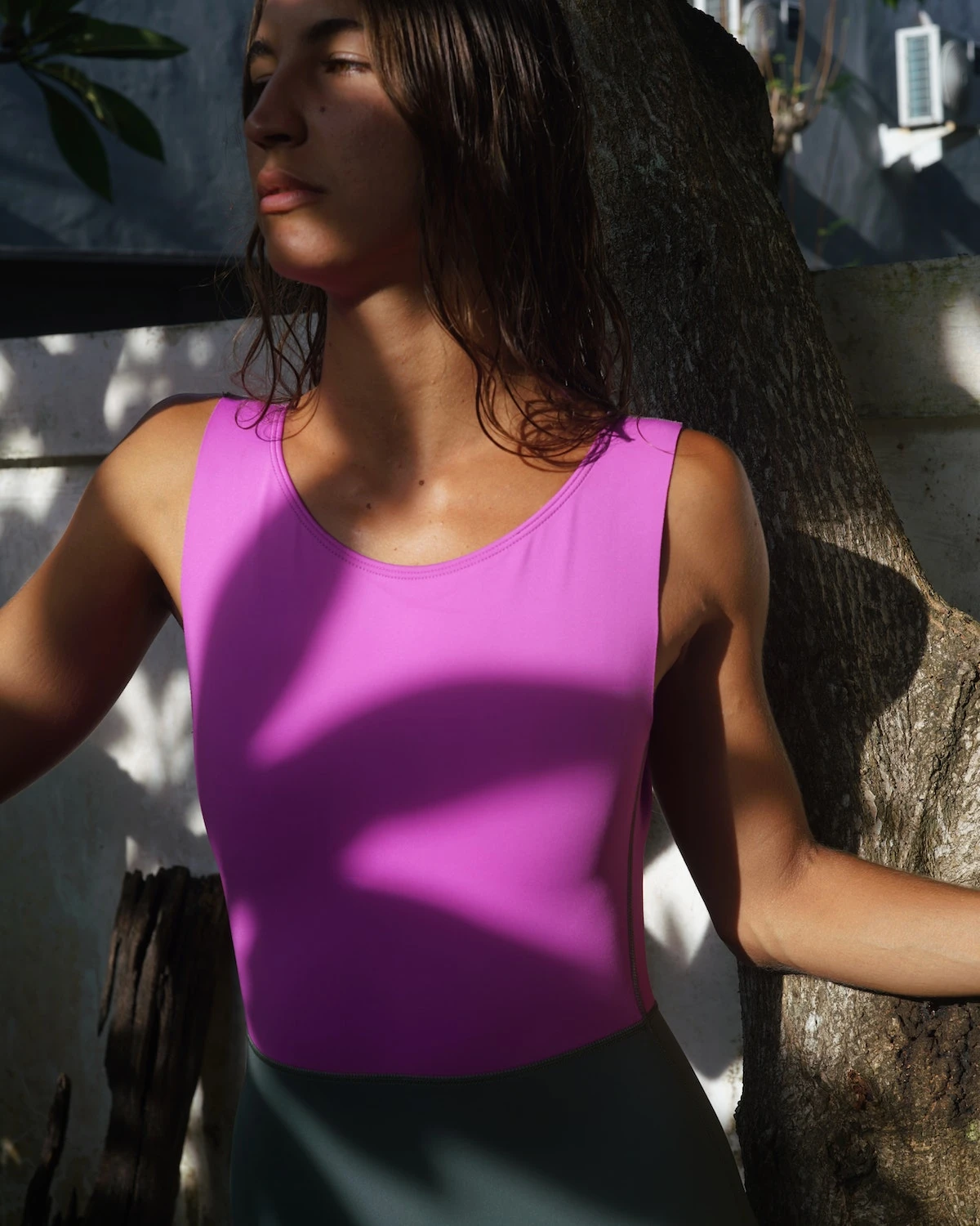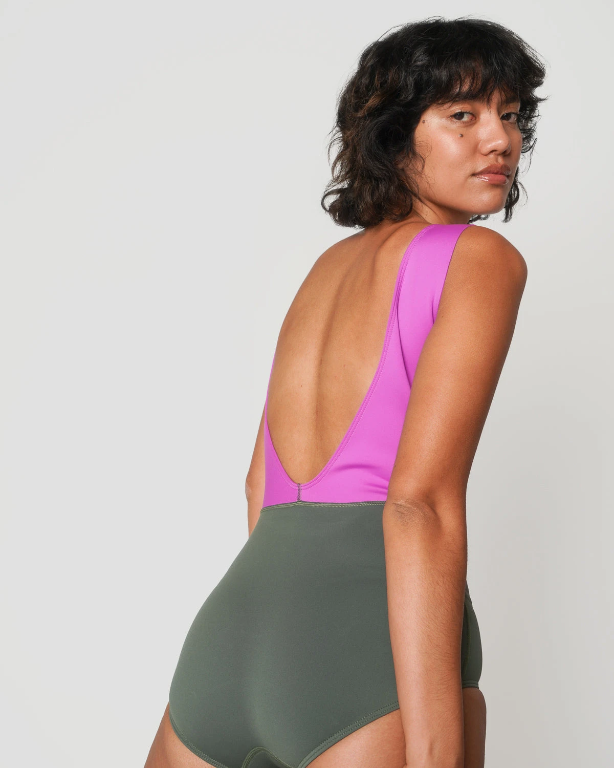 Modern minimalists will appreciate the Lido One-Piece’s clean silhouette and balanced color-blocking. With a high neckline, retro cut bottom, and a sultry deep-V back, the Lido in recycled C-Skin fluidly glides over your body’s curves.