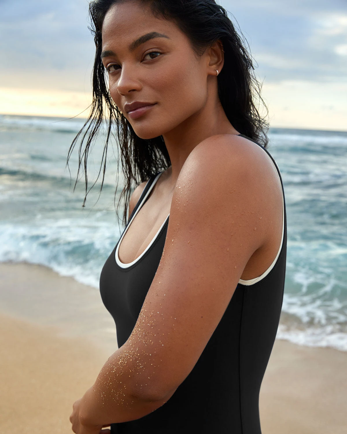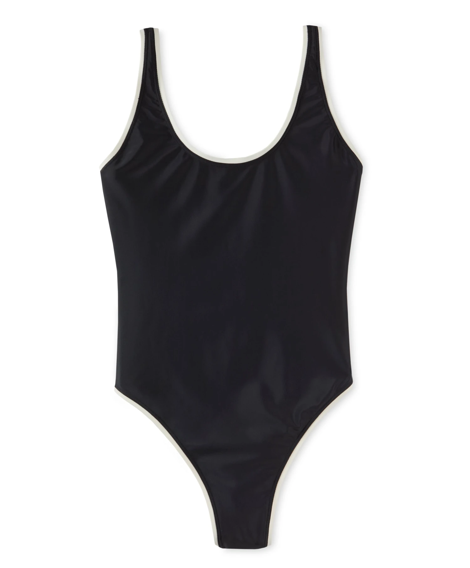 Featuring a slightly higher cut leg,flattering scoop neckline, and ivory trim along all edges, this versatile suit is fully lined and offers a supportive fit.